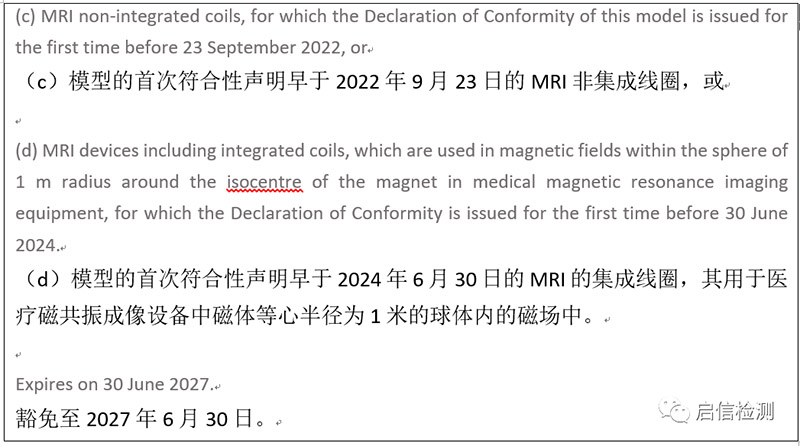 (EU) 2022/1632指令中提到考慮到當(dāng)前核磁共振醫(yī)療設(shè)備(MRI)已經(jīng)有可用的新型無鉛線圈,但舊設(shè)計的MRI設(shè)備依賴于含鉛的MRI組件,并在與新型無鉛MRI組件的兼容性方面受到高度限制。為了為醫(yī)療衛(wèi)生服務(wù)提供兼容的MRI,并為開發(fā)無鉛替代品留出時間,應(yīng)在修訂范圍的基礎(chǔ)上延長豁免。具體增加的條款內(nèi)容如下: