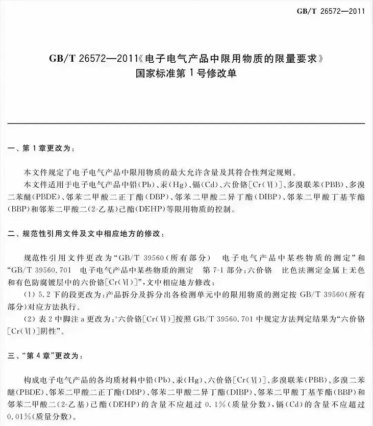 2、 將測試方法標(biāo)準(zhǔn)由GB/T 26125-2011調(diào)整為GB/T39560(所有部分) 電子電氣產(chǎn)品中某些物質(zhì)的測定;