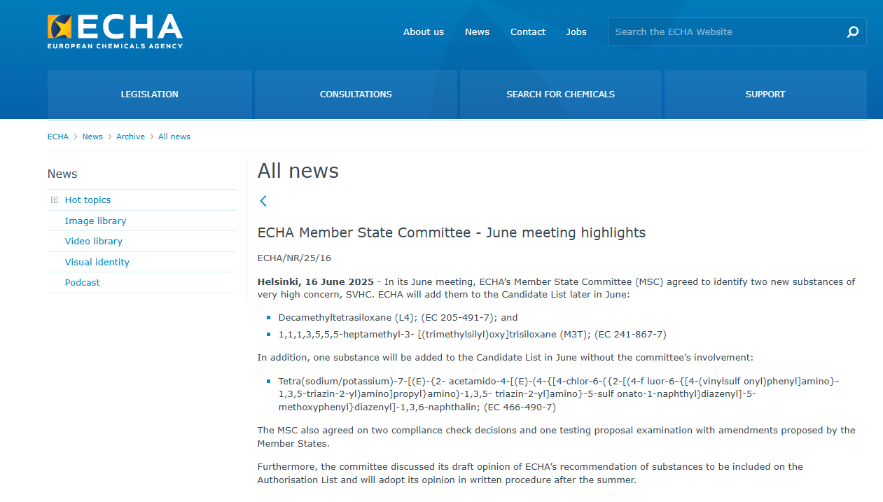 2025年6月16日,歐洲化學(xué)品管理局(ECHA)宣布將在6月底將3項(xiàng)物質(zhì)列入新一批SVHC候選物質(zhì)清單。屆時(shí),SVHC候選清單物質(zhì)將增加至250項(xiàng)。